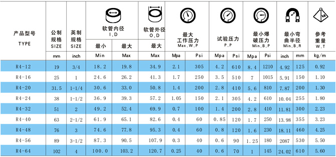 適用于使用石油基液壓油,溫度范圍-40℃~+100℃(-40°F~+212°F)的軟管。
